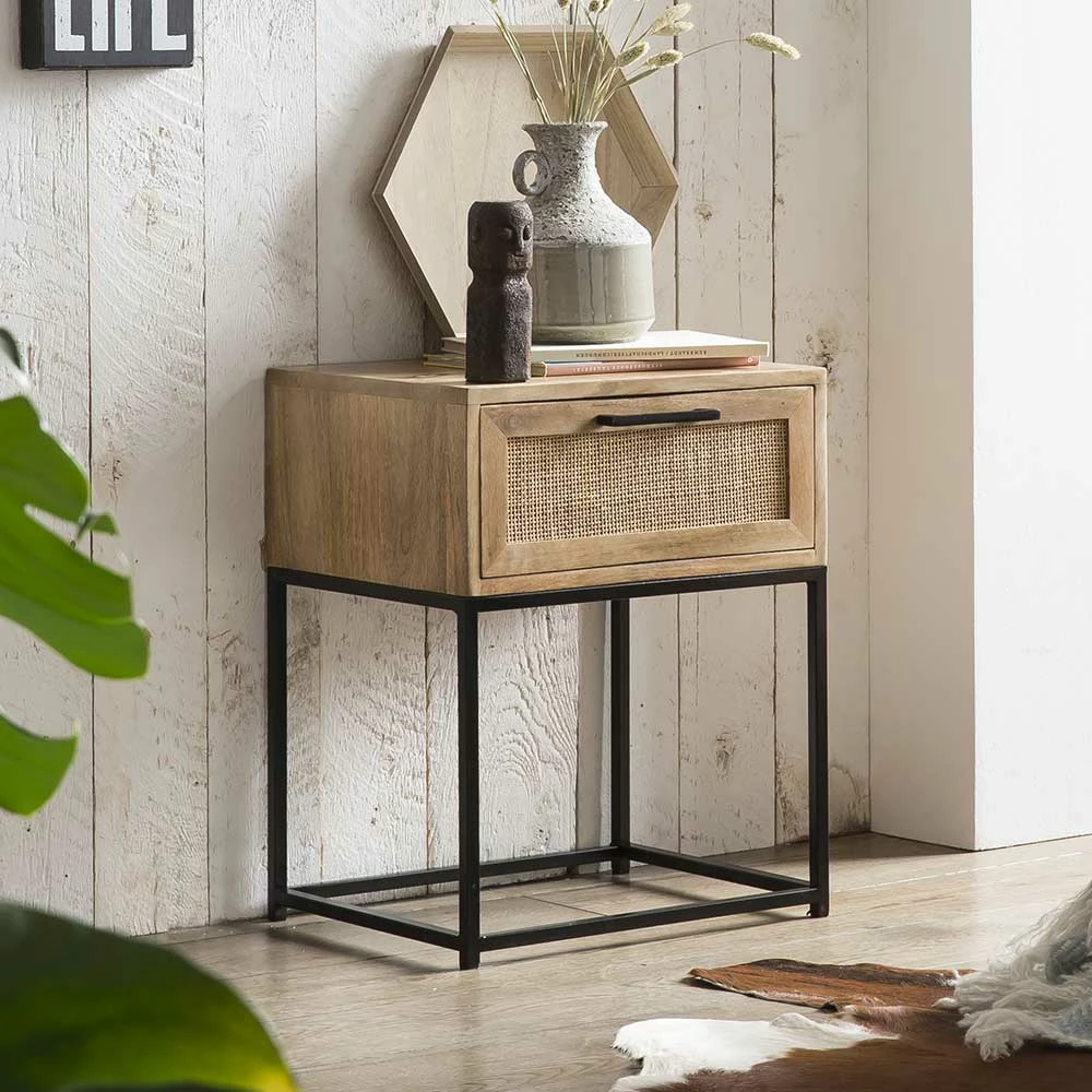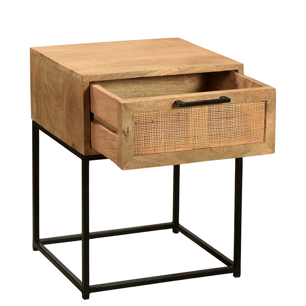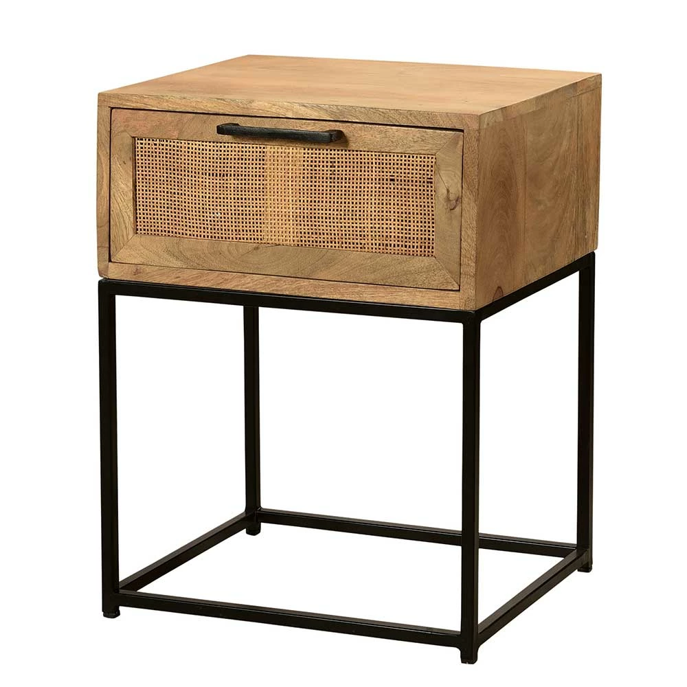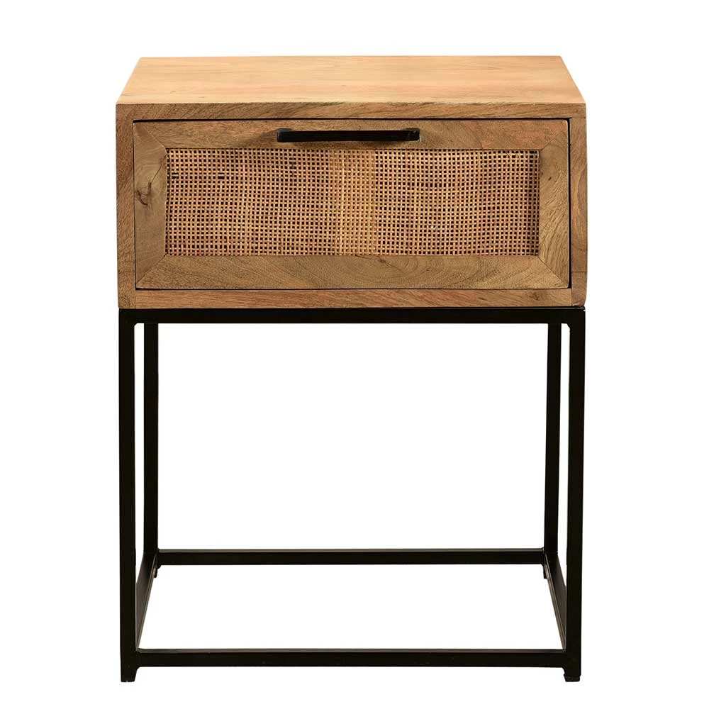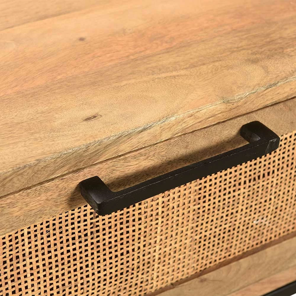 - Hergestellt aus Mangobaumholz, Metall und Rattan