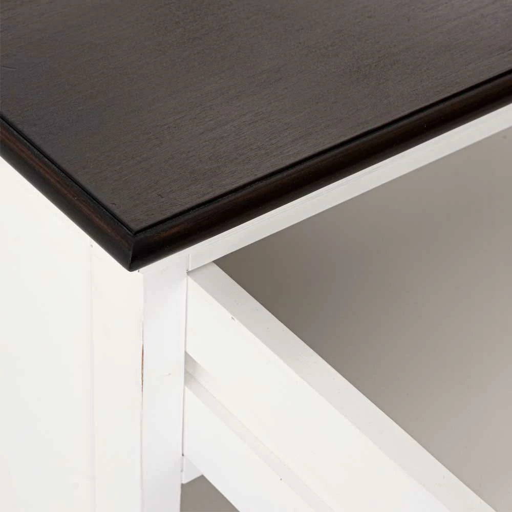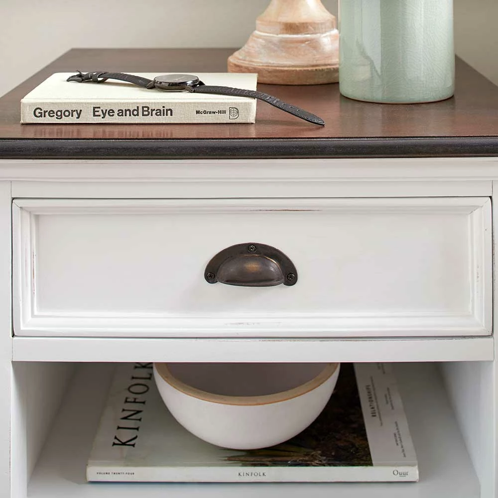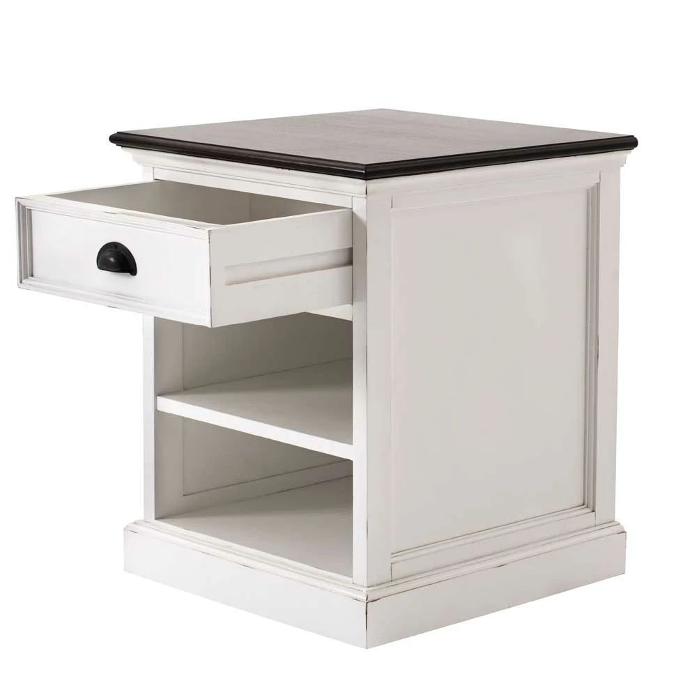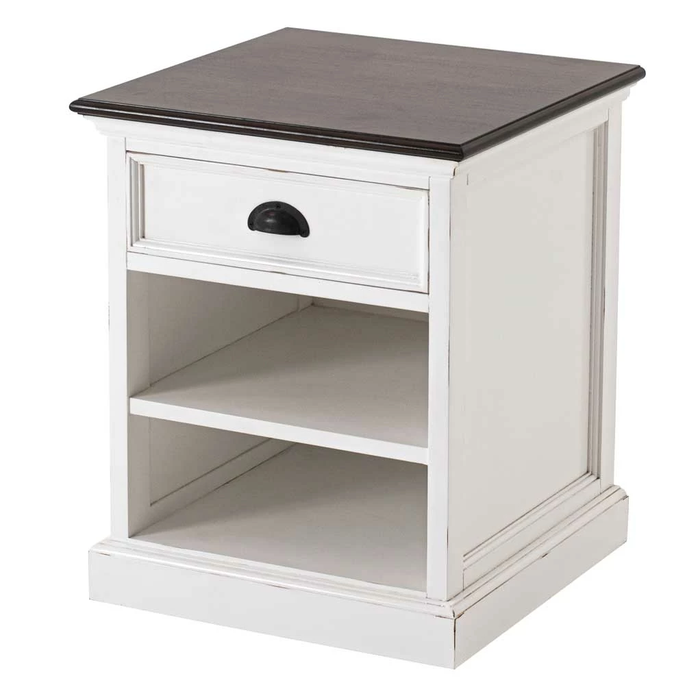 - Kontraststarker Nachttisch in Weiß und Mahagonifarben