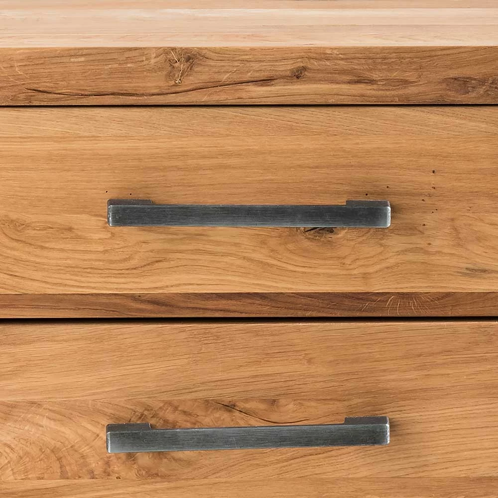 - An jeder Schublade findet sich ein eckiger Metall-Bügelgriff